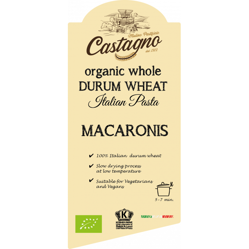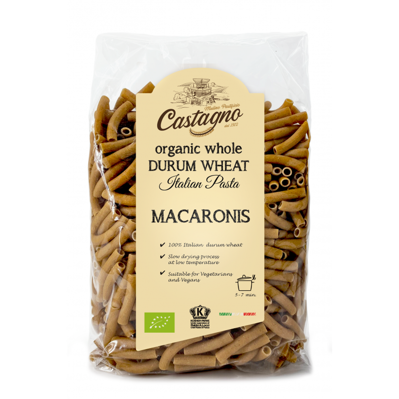 Castagno Organic Whole Wheat Macaronis is made from flour that contains all three of parts of the durum wheat -- germ, bran and endosperm. It is high in fiber that lower risk of heart disease and lower body weight. It also retains the vitamin and mineral content better than the pasta made from white flour that contains only the endosperm. The pasta making is marked by a slow drying at low temperature enabling to retain the maximum nutrition and taste of the wheat.