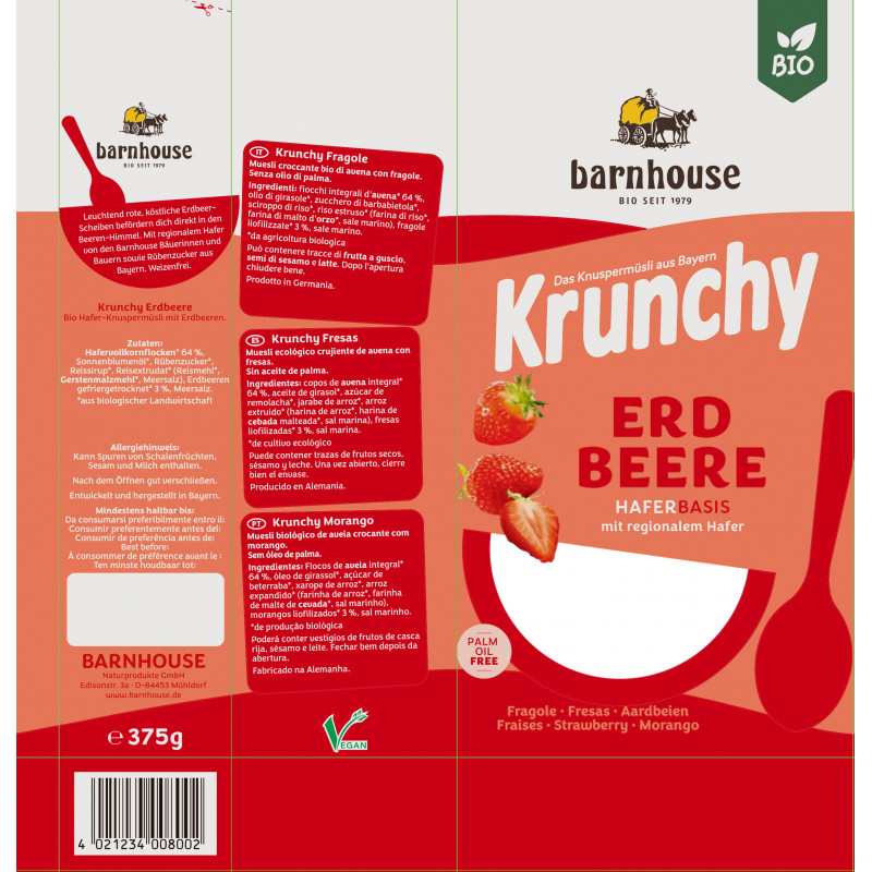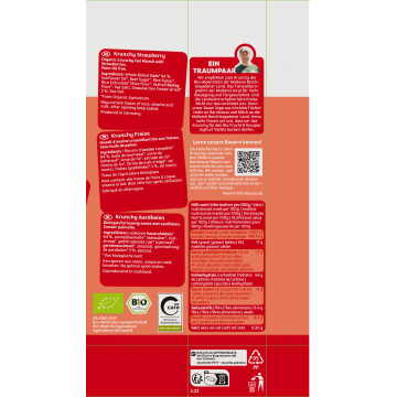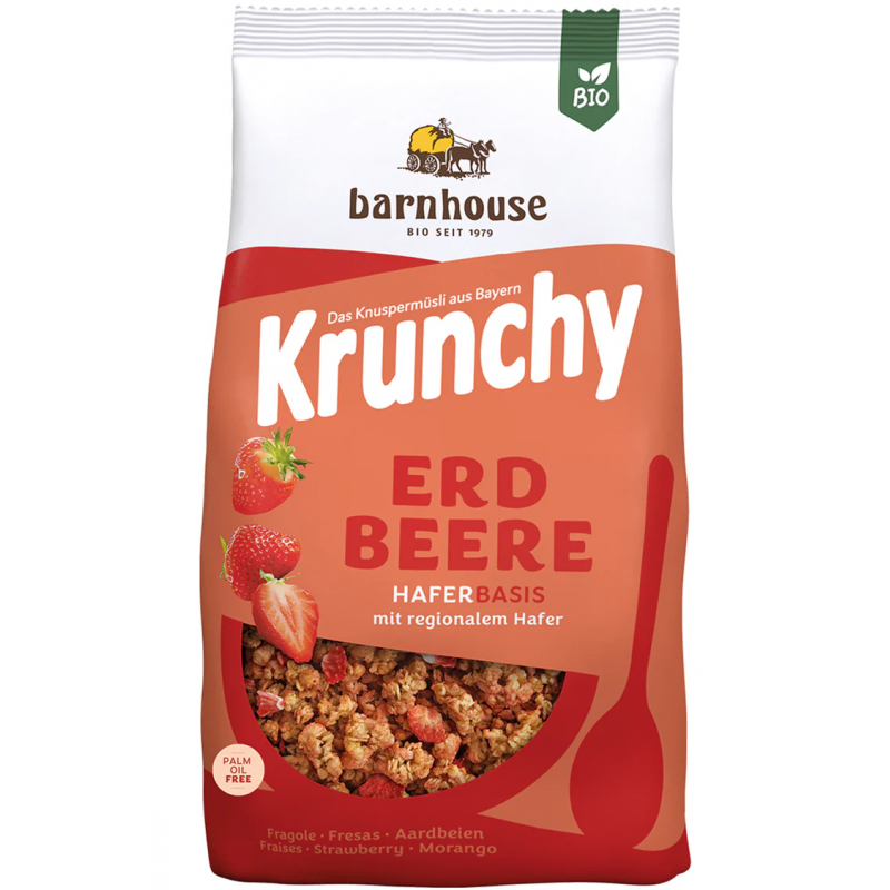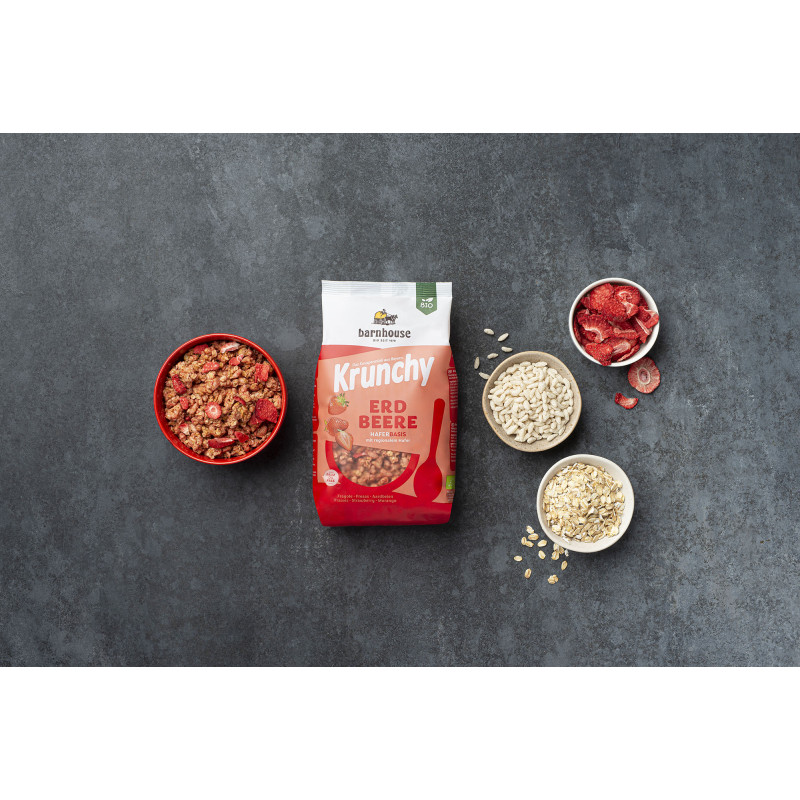 The incomparable taste comes exclusively from the berries themselves, artificial flavorings are absolutely taboo for us - as in every Krunchy! And you will hardly find any other krunchy muesli that spoils your palate with so many strawberries.