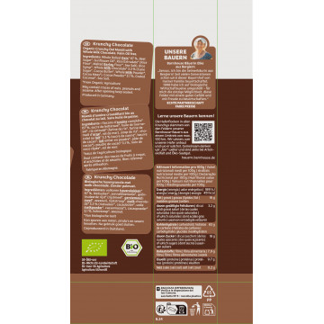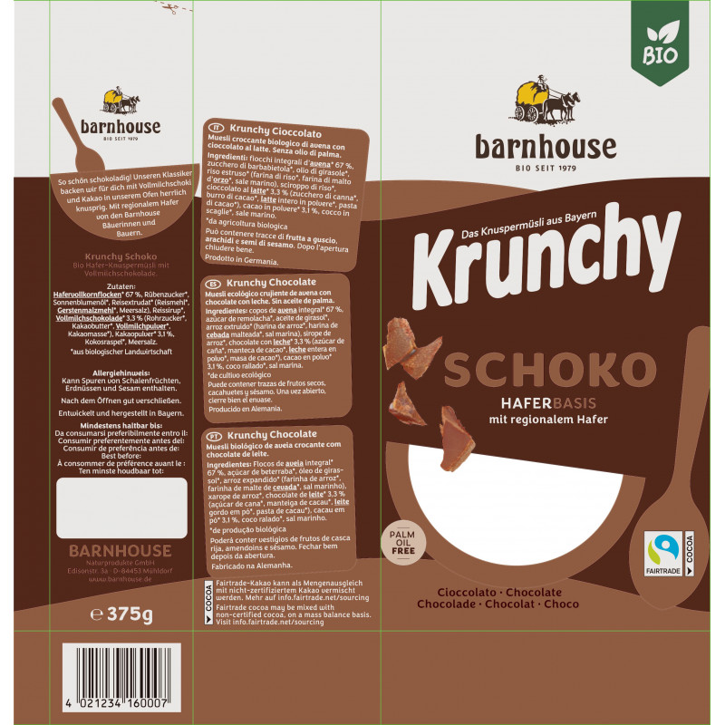 Barnhouse Krunchy Chocolate Muesli blends organic oat clusters with rich, dark chocolate pieces for a deliciously indulgent yet wholesome breakfast. Perfect for chocolate lovers seeking a satisfying, crunchy start. Made in Germany.