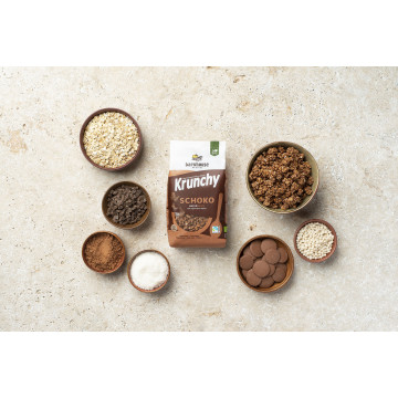We stir fine organic whole milk and dark chocolate into the Krunchy recipe and bake them with it. So you can look forward to particularly aromatic crispy clusters. Wonderfully chocolaty with a biscuit bite – delicious! With additional Fairtrade-certified cocoa and some grated coconut, we round off Krunchy Chocolate to a real delicacy. The perfect muesli for a great start to the day or a chocolate snack.